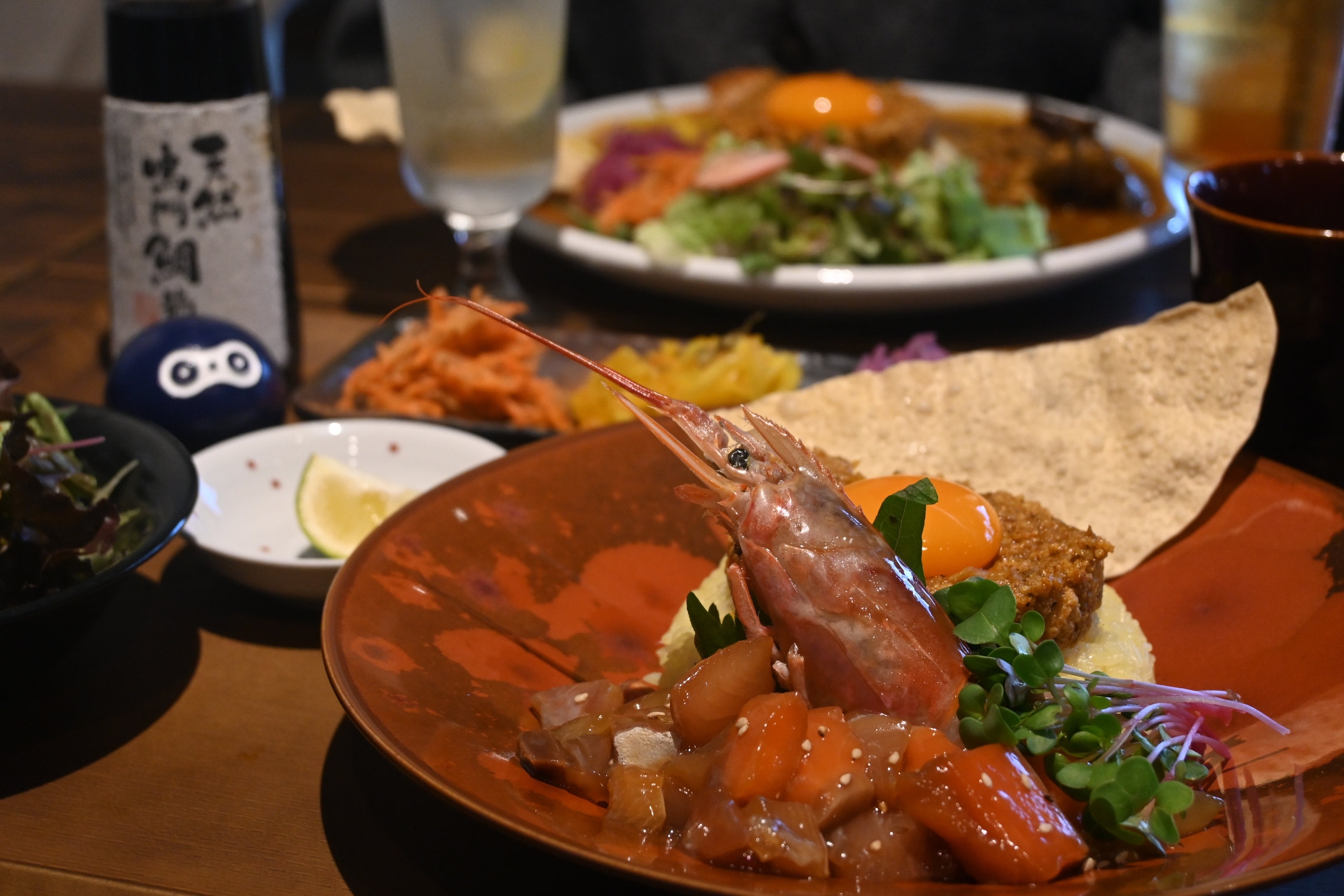 なんと!カレーの上に漬けダレにつけられた海鮮が!!コンナ「curry」ミタコトナイ~😲