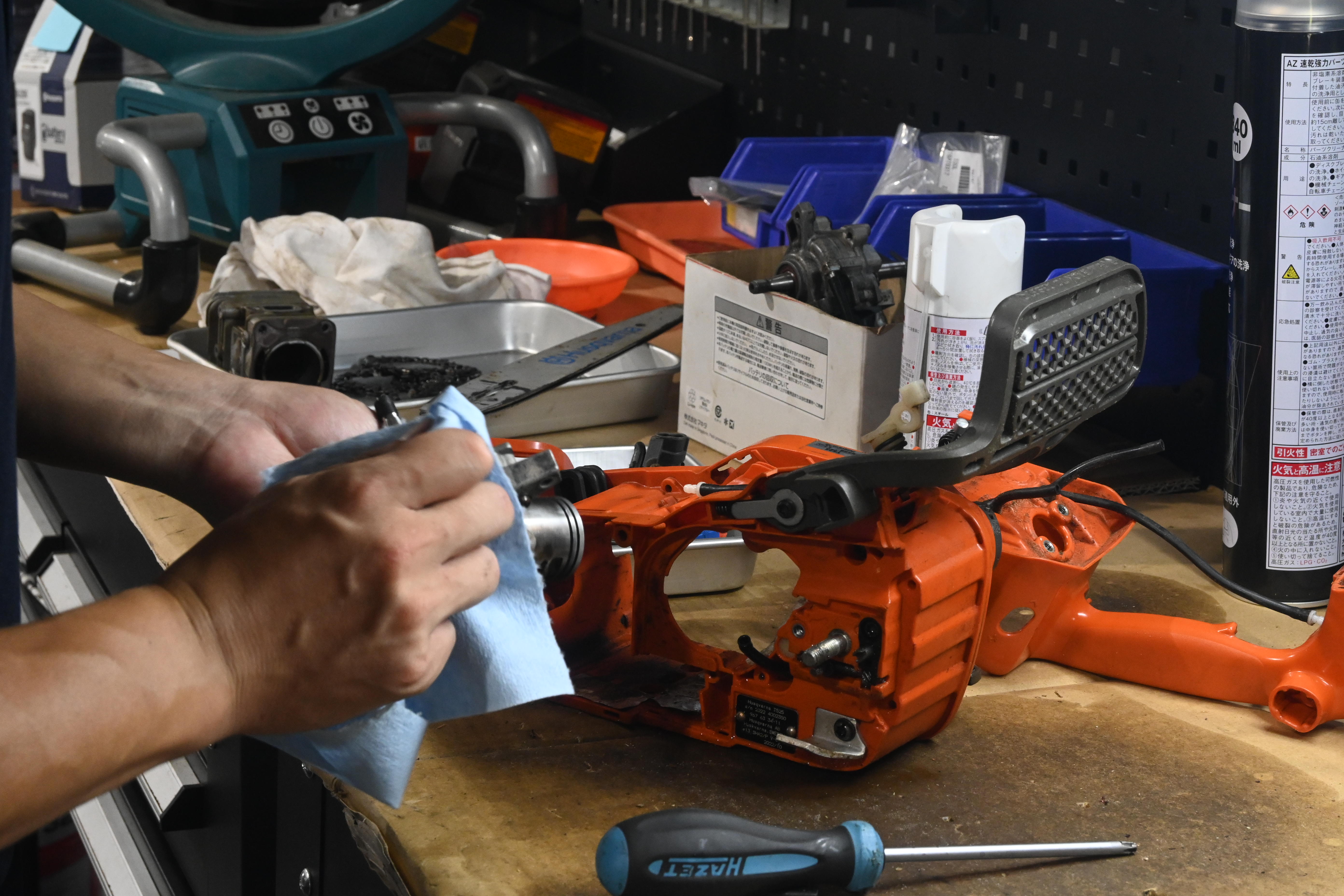 店内には、ピカピカのチェーンソーや草刈り機が所狭しと展示されている。そのフォルムデザインの美しさ・カッコ良さに取材陣一同、見惚れてしまった。正真正銘のプロユースから、家庭用まで幅広くラインナップされている。